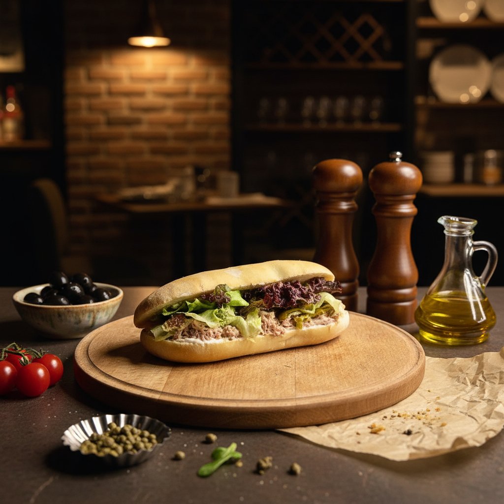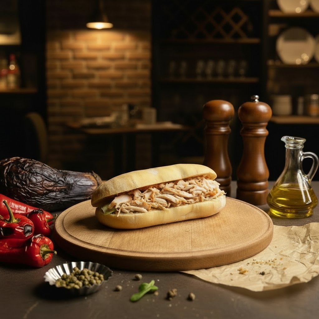 Фирменный хлеб панини с майонезом, тунцом, перцем халапеньо и листьями салата.