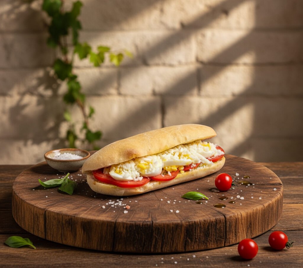 Фирменный хлеб панини с крем-сыром, помидорами, варёным яйцом, песто-соусом и перцем.Песто содержит: базилик, фундук, чеснок, арахис.